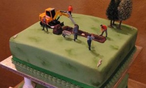This cake is in the form of a section, with turf and layers, and a trowel beside it. It was made…